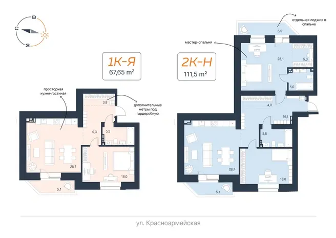 2 с просторной кухней-гостиной (28,7 квадратов), большой мастер-спальней с отдельной лоджией и окнами с видом на две стороны.