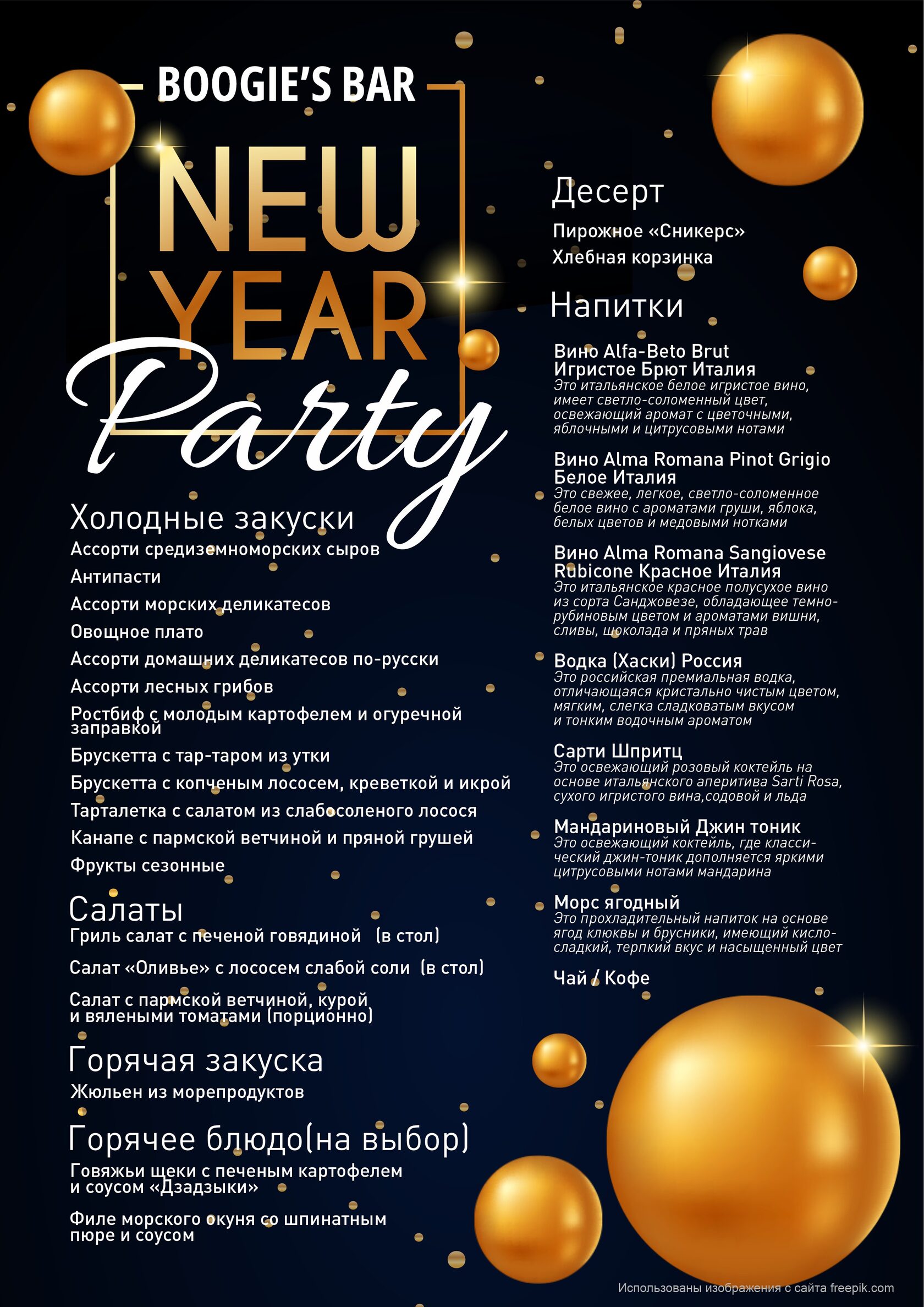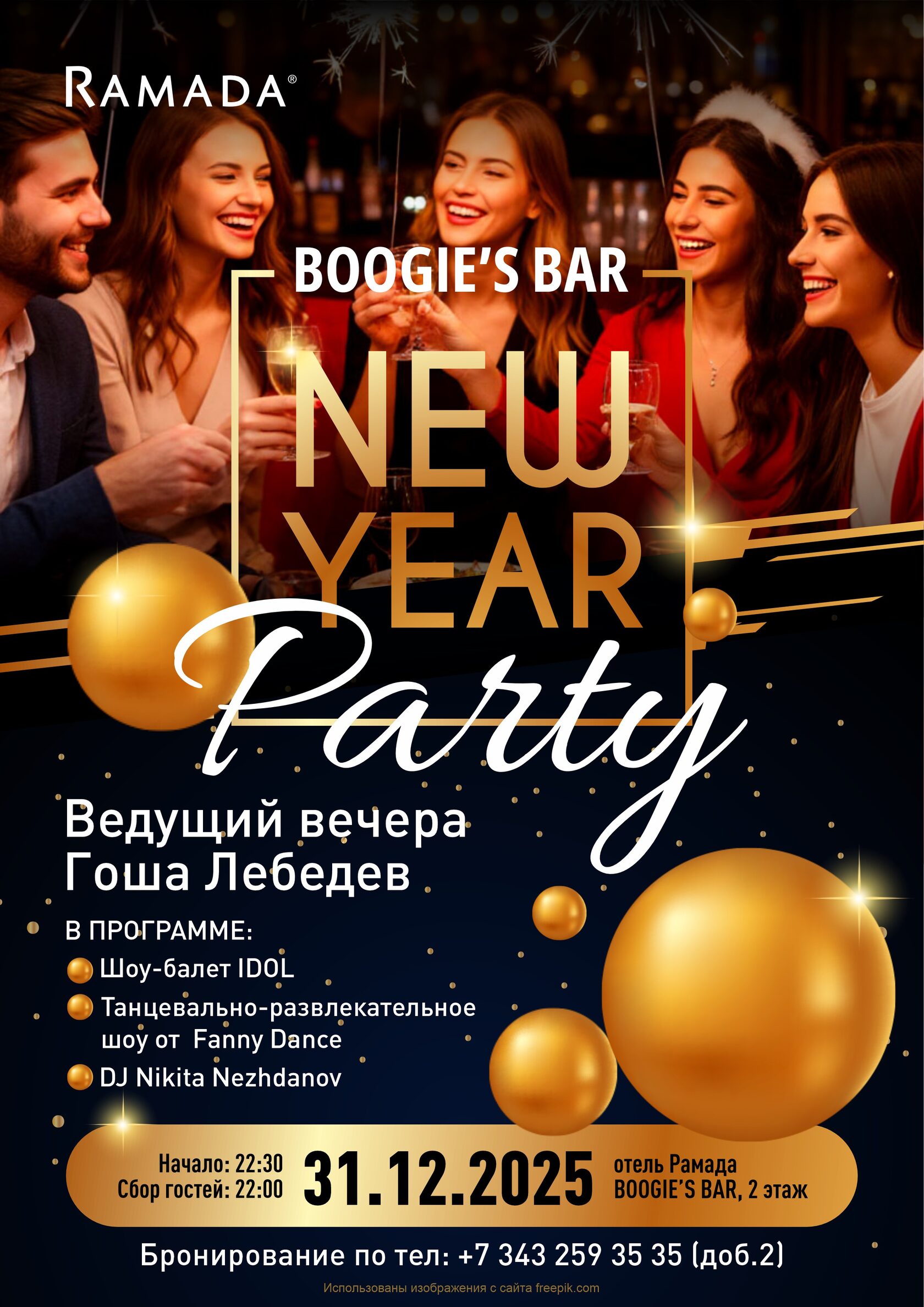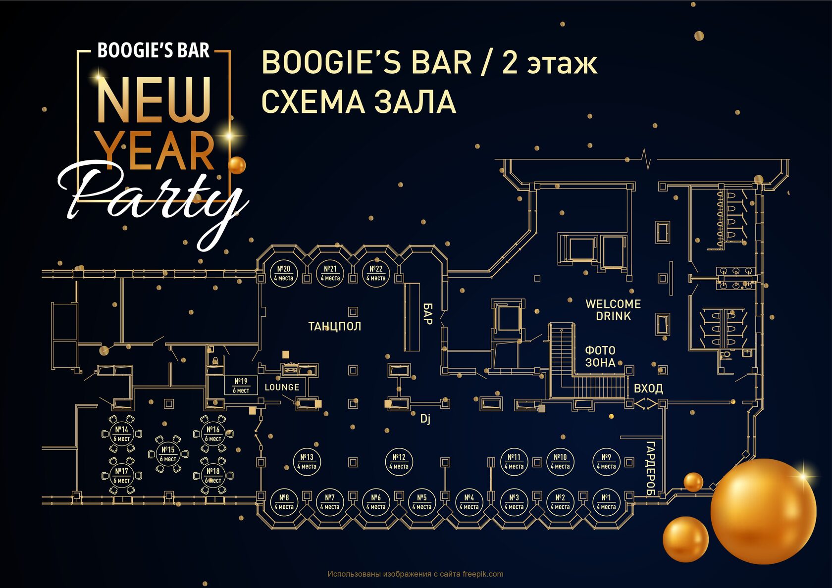 Boogie’s Bar гостей ждет яркое шоу, которое проведет бессменный Гоша Лебедев. В программе новогодней ночи - один из лучших современных танцевальных проектов - шоу-балет IDOL, который придаст вечеру атмосферу романтики, зажигательное танцевальное шоу FUNNY DANCE, отборные треки от DJ NIKITA NEZHDANOV.